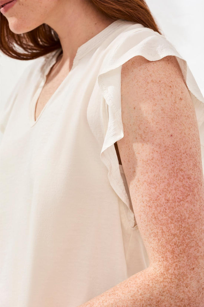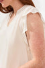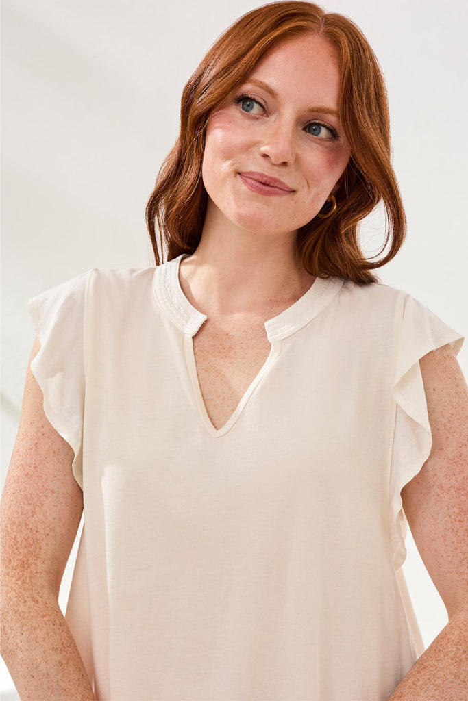 Effortlessly stylish, this mixed media top pairs a soft cotton base with charming ruffle sleeves for a look that's both playful and put-together. The flattering V-neck design works beautifully for casual outings, weekend gatherings, or relaxed workdays. Layer it or wear it solo—this versatile piece adapts to your personal style with ease.