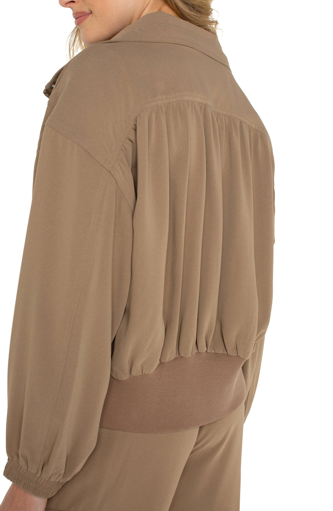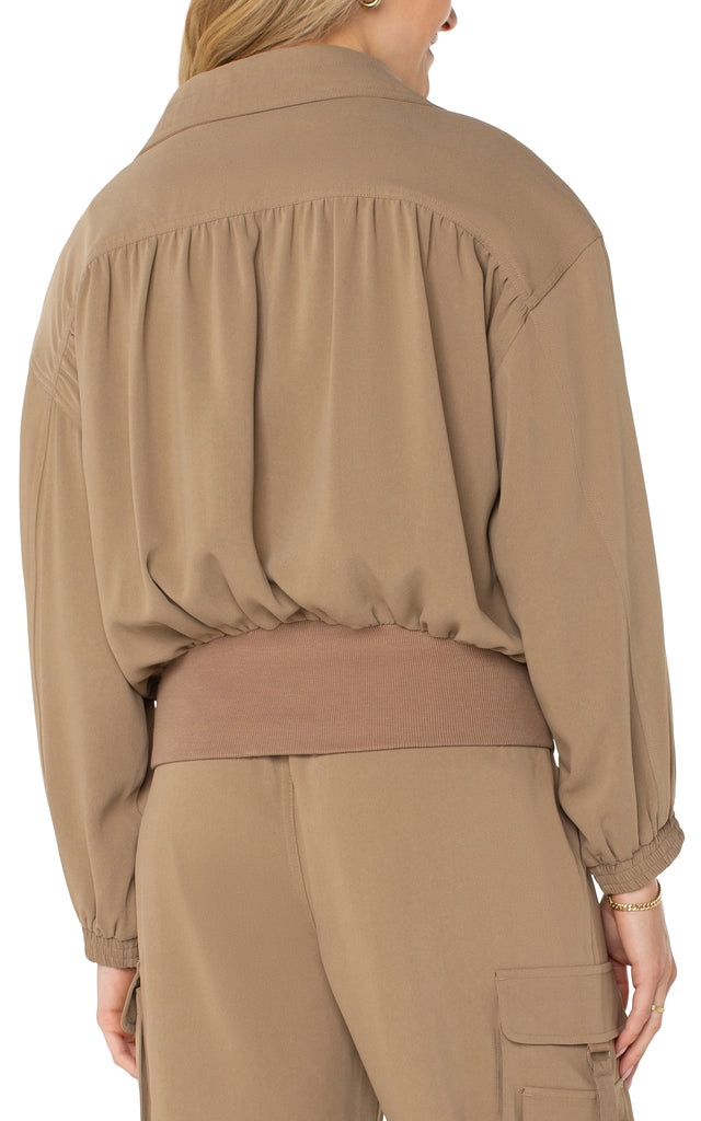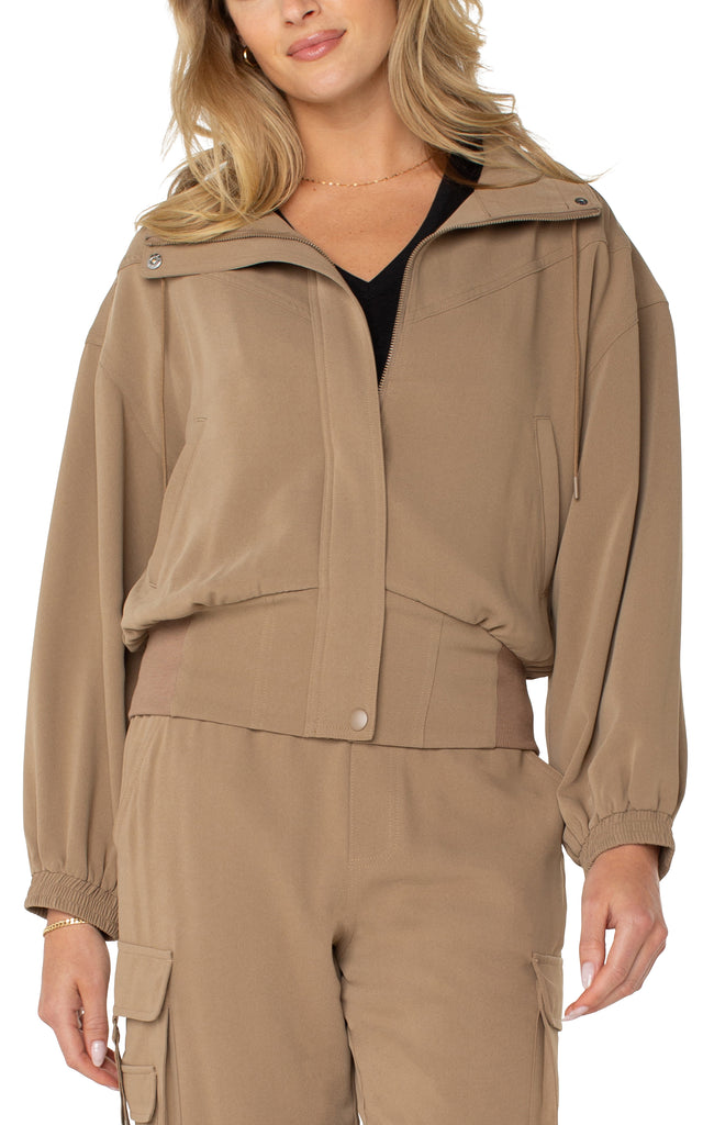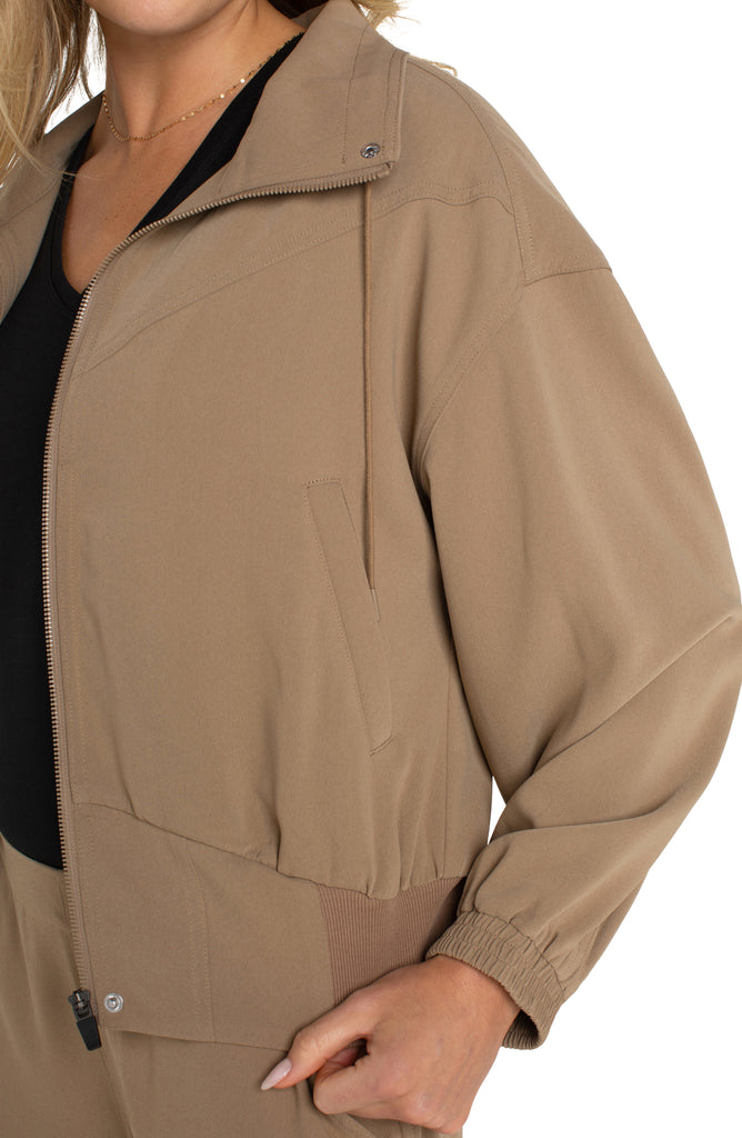 Introducing the must-have Palo Santo Zip Up Jacket - a statement piece that will surely capture attention. With dolman sleeves, a concealed zipper, and an elasticized hem, this trendy jacket exudes both fashion and function. The wide mock neck collar and adjustable drawcords add an extra touch of style, making it perfect for any casual outing. For the ultimate stylish ensemble, pair it with the Parachute Cargo Pant and be prepared to make a statement!