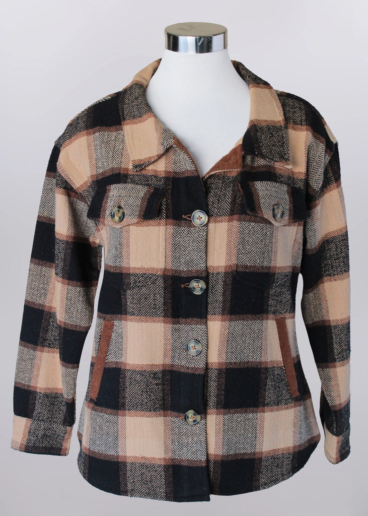 This versatile shacket combines the comfort of a shirt with the warmth of a jacket, featuring a classic plaid pattern in rich brown, black, and tan tones. The long sleeves and full button front make it easy to layer and adjust to your comfort level, while the collar adds polished structure. Four functional pockets—two with button flaps—give you practical storage without sacrificing style. Perfect for layering over tees or wearing solo, this piece is designed to become a go-to favorite in your wardrobe.