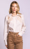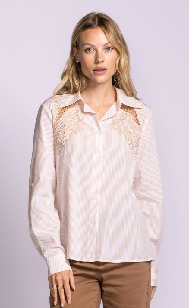 Elevate your everyday wardrobe with the Quinton Top, a charming pinstriped button-down that blends timeless style with unexpected flair. The delightful embroidered peek-a-boo accent adds personality and intrigue to this versatile classic. Wear it crisp and tucked, layer it casually, or style it open—this piece adapts beautifully to your mood and occasion, making it a go-to favorite you'll reach for again and again.