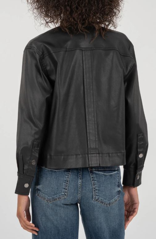 This coated jacket features dropped shoulders for a comfortable, easygoing fit, complemented by stylish silvery snaps.