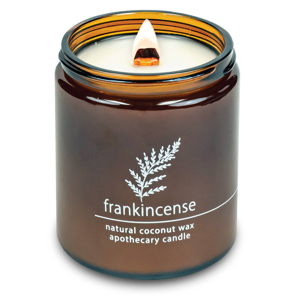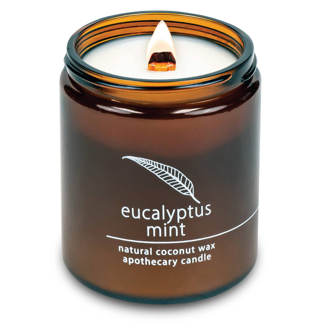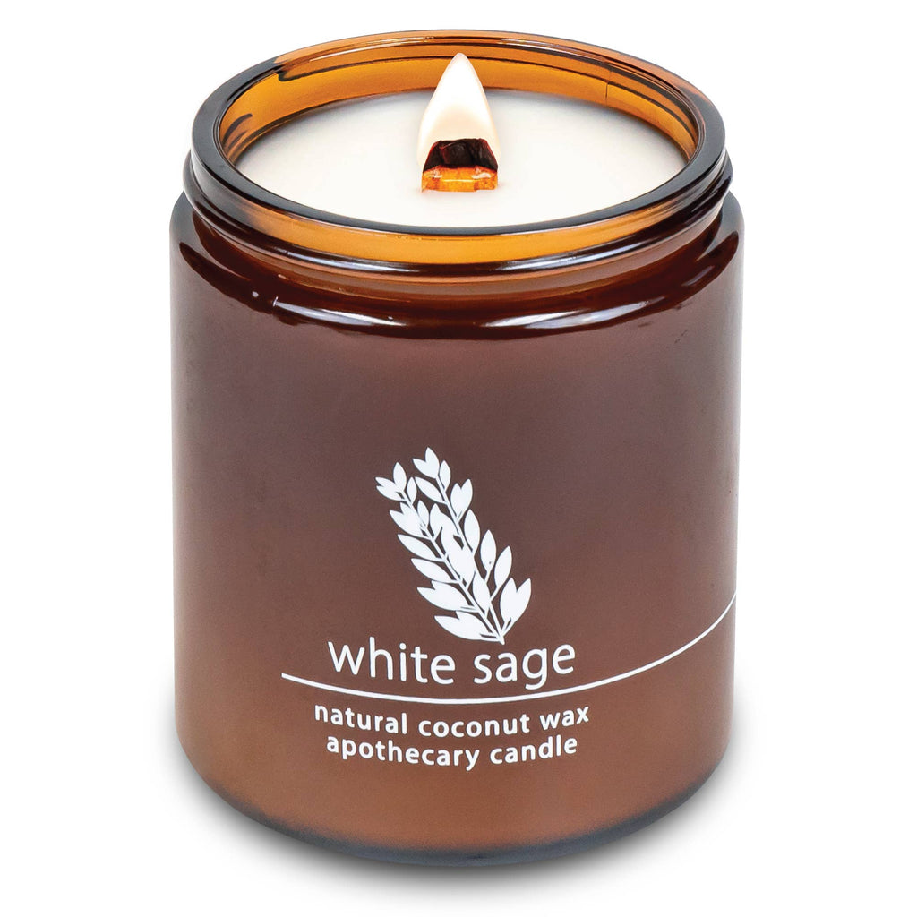 Best selling 8 oz. natural coconut wax apothecary candles with a crackling wood wick, amber glass jar, and black metal cap. Made with natural ingredients including plant-based coconut wax and herbaceous aroma blends made with essential oils.