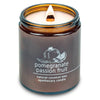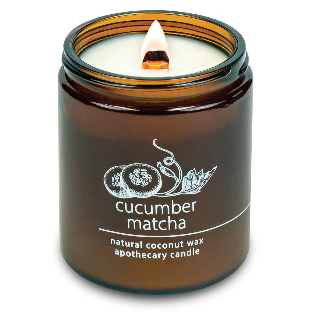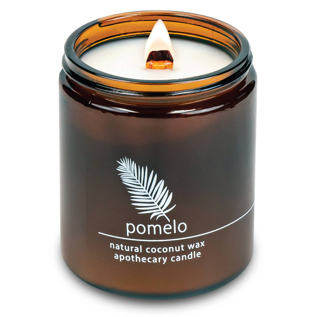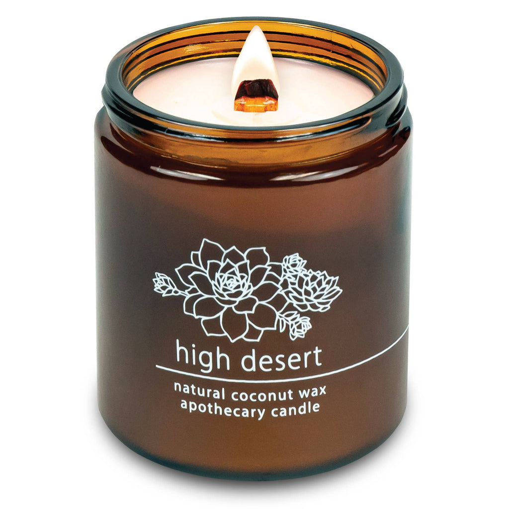 Best selling 8 oz. natural coconut wax apothecary candles with a crackling wood wick, amber glass jar, and black metal cap. Made with natural ingredients including plant-based coconut wax and herbaceous aroma blends made with essential oils.