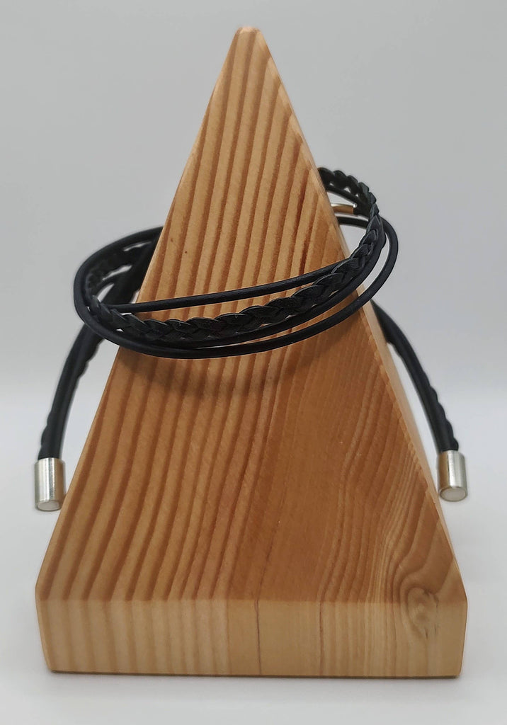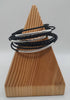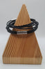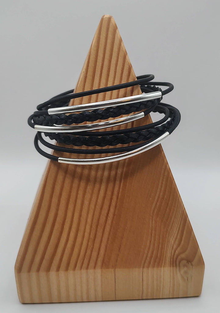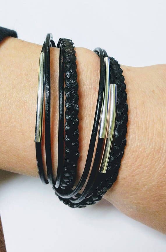 This is a double wrap bracelet made with licorice leather and flat braided leather. It can be worn as a double wrapped bracelet or single necklace. It is a 100% real leather bracelet made with 2 mm licorice cord, braided flat leather, and silver plated tubes. It has a total of five leather cords that are wrapped around the wrist twice, allowing for a ten cord multilayered effect. This bracelet is made to fit the average wrist size of approximately 6 1/2 to 7 inches.