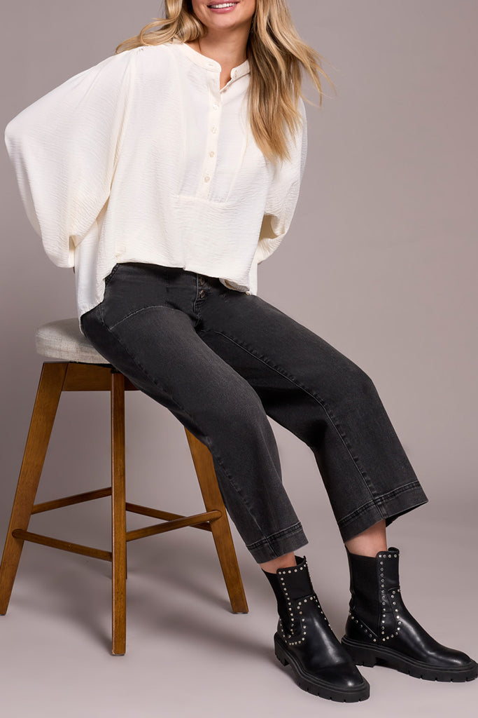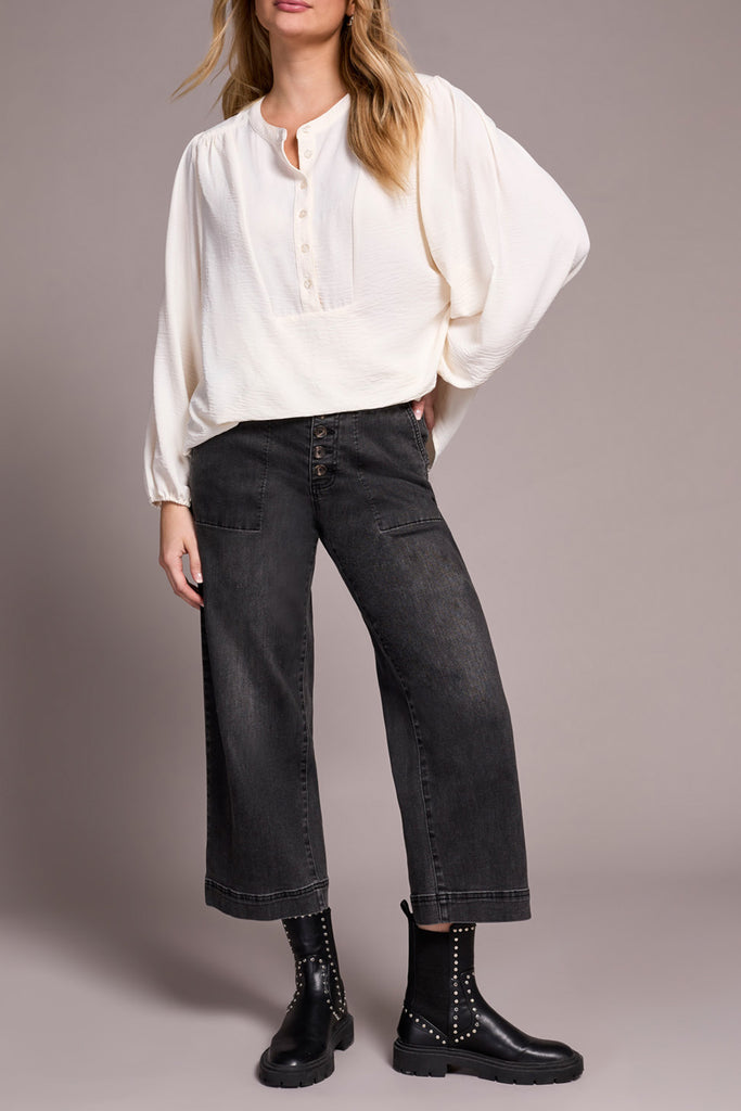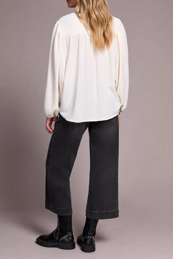 Experience easy elegance with lightweight woven fabric that flows gently for a comfortable, airy sensation. This blouse includes a buttoned placket that elevates the classic crew neckline, paired with long sleeves for a sophisticated look. Delicate shirring and a neatly folded hem refine the shape, creating a harmonious blend of relaxed and chic style.