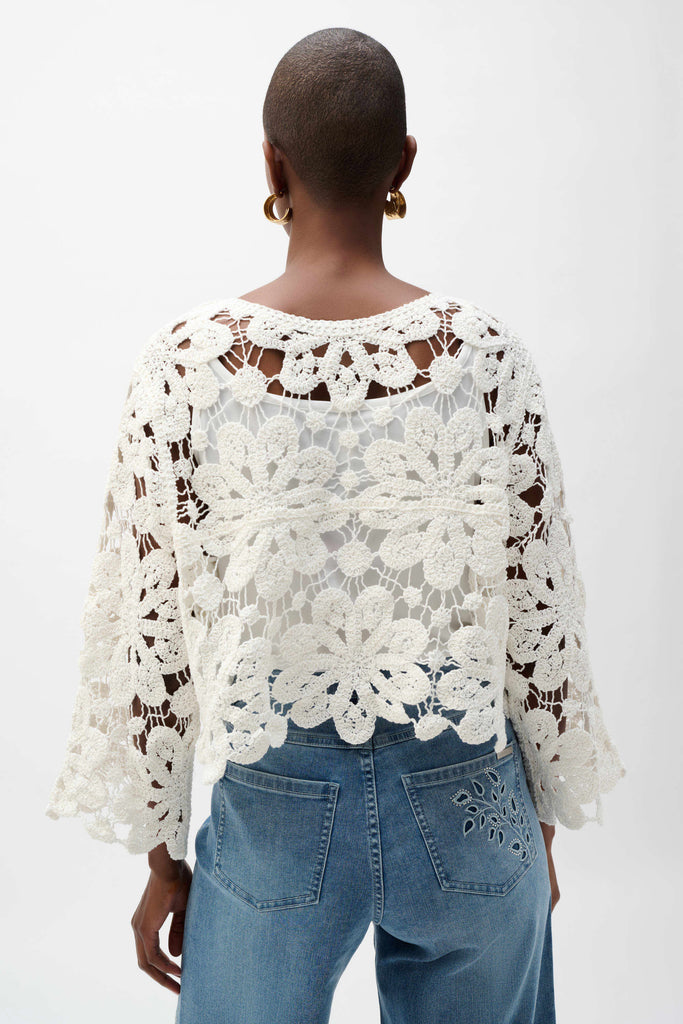 Crafted from soft knit cotton, this cardigan delivers effortless style with its relaxed boxy silhouette and intricate crochet accents. The three-quarter sleeves offer a modern touch, while coordinating buttons add refined detail. Perfect for layering over your favorite pieces, this versatile essential transitions seamlessly from casual to polished occasions.