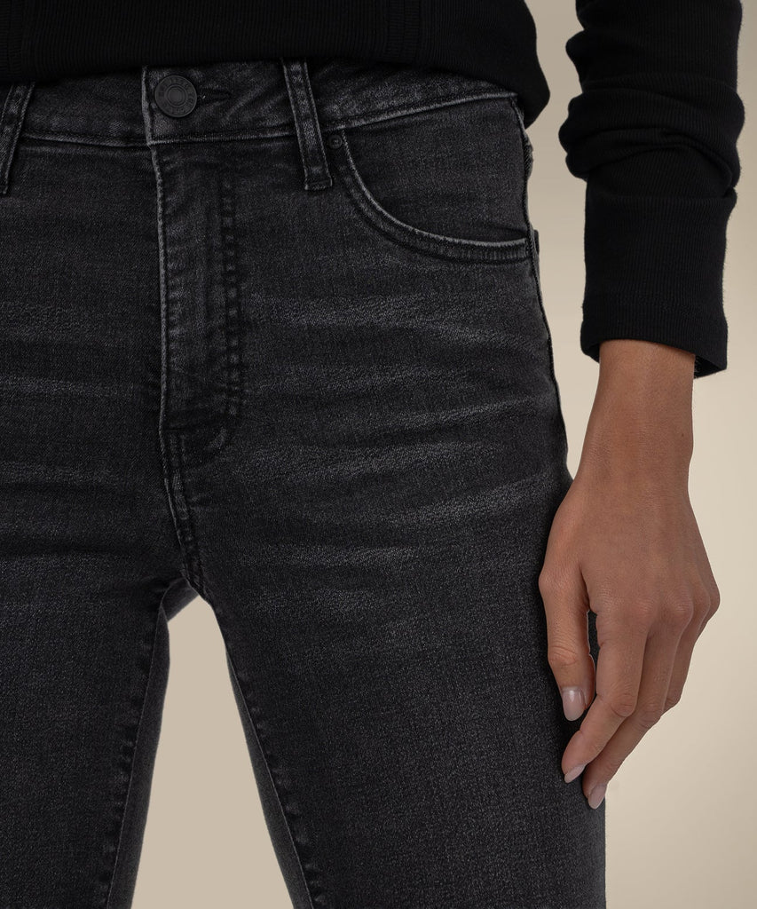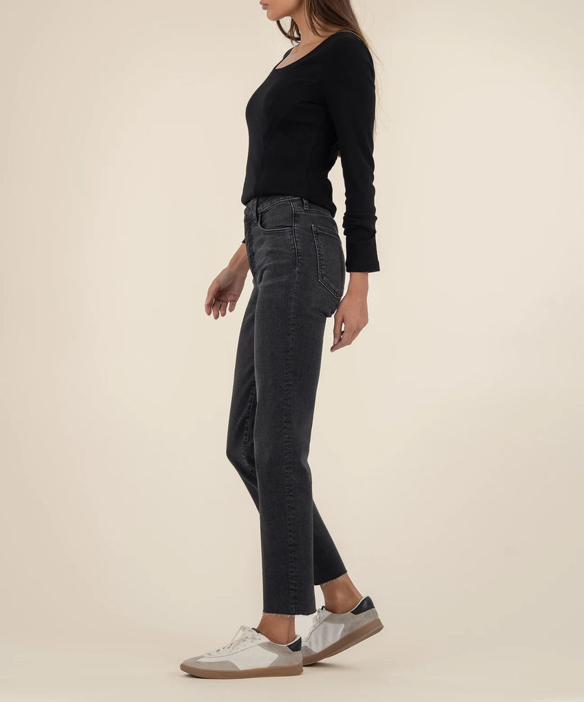 Embrace timeless style with these high-rise straight-leg jeans featuring a beautifully faded black wash and raw hem detailing. Crafted with KUT's signature Fab AB front pocket design, they offer a flattering silhouette that smooths and slenderizes while keeping you comfortable all day. Perfect for anyone seeking that effortlessly cool vintage aesthetic with modern functionality.