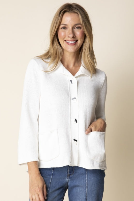 A cozy layering piece that brings warmth and style together. This sweater jacket features a charming pleated back design, functional pockets for everyday convenience, and thoughtful button details that add character. Perfect for staying comfortable while looking put-together.