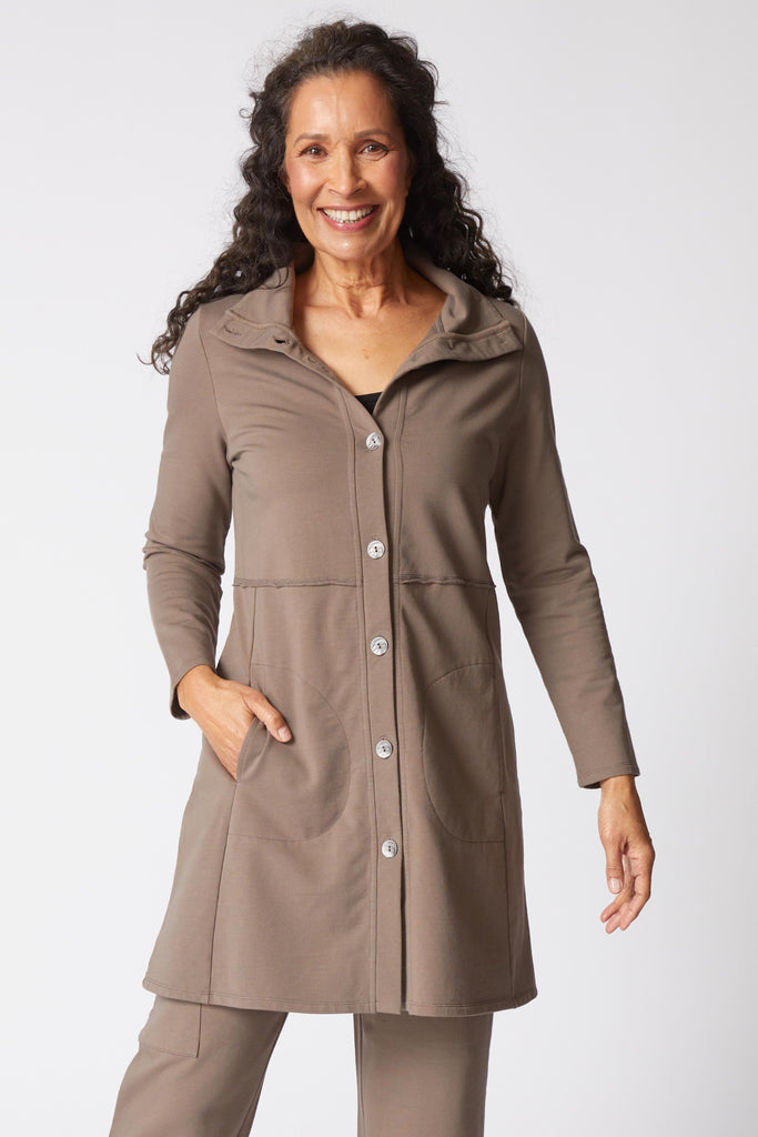 The Habitat Car Coat, made from soft French Terry, blends classic design with a comfortable, relaxed fit ideal for daily layering. Its breathable cotton-spandex mix delivers balanced stretch and shape, making it reliable for changing seasons. In the warm Truffle shade, this adaptable coat complements jeans, leggings, or pants, creating a refined yet casual outfit.